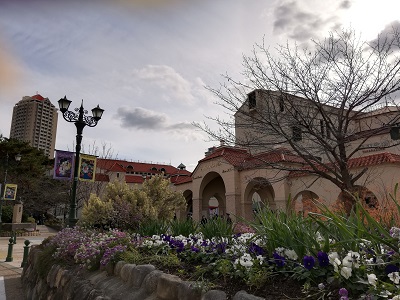 『恋する天動説』、初日公演の宝塚大劇場の正門、真冬のわりには咲いている花が多くてうれしい。