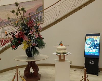 改札内ロビーの鏡餅と生け花