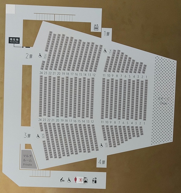 東京建物 Brillia HALL 箕面の1階の座席表、男子トイレは1階、2階とも女子用に変更になっていました。